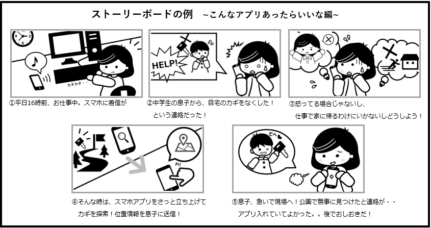 ストーリーボードは、ユーザーの行動や体験を一連の流れとして視覚化したものです。具体的なアウトプット形式は「理想とするユーザーの体験」を絵コンテのようなストーリー仕立てで示したものです。