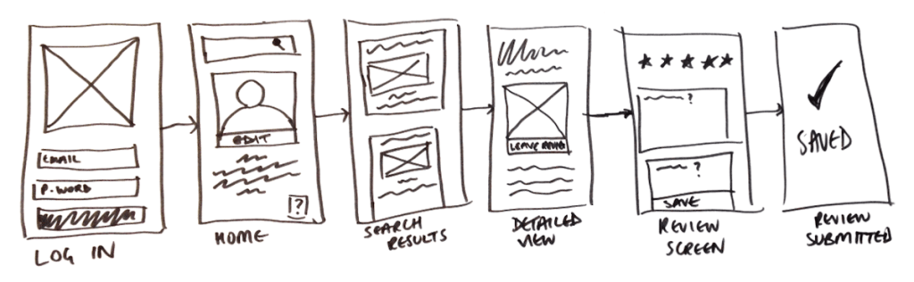 描画ツールすら必要なく、手書きレベルで問題ないので、このようにページが遷移し機能が利用できるというイメージを紙芝居的に示しています。このように、ワイヤーフレームも初期のステークホルダーとの認識合わせで利用することができます。