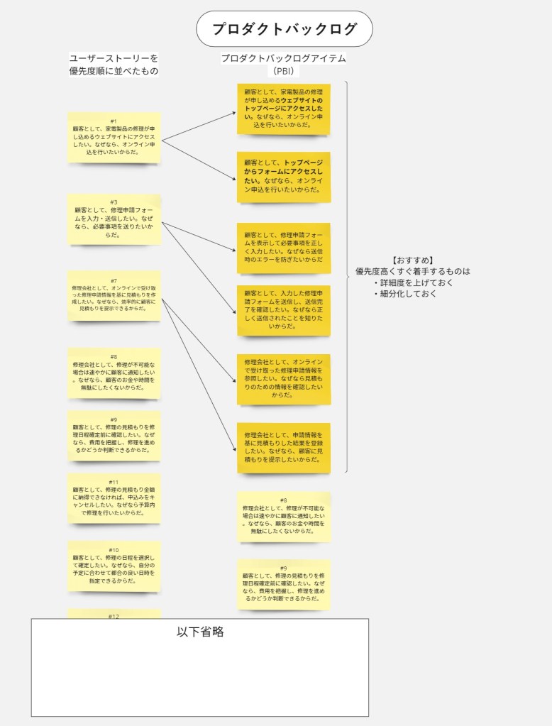 また、おすすめなのは、優先度が高くすぐに着手するものは、PBIとして並べるタイミングで、(必要に応じて)詳細度を上げておく、細分化しておくことです。