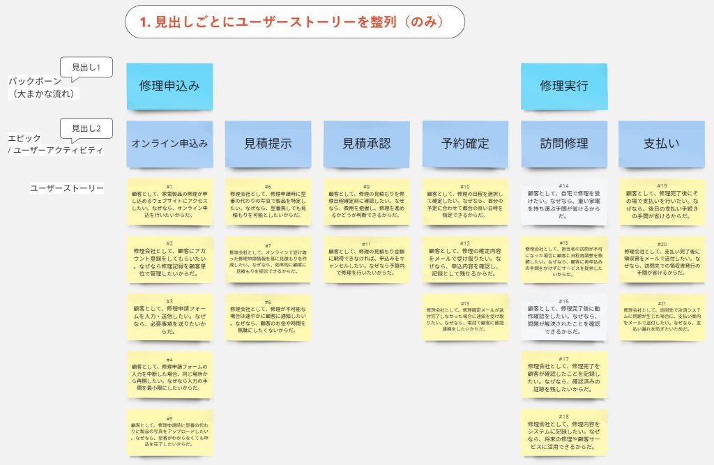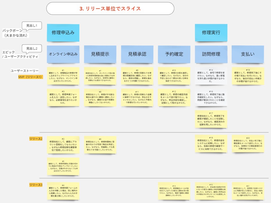 上記のユーザーストーリーを元に、ストーリーマッピングを行います。
