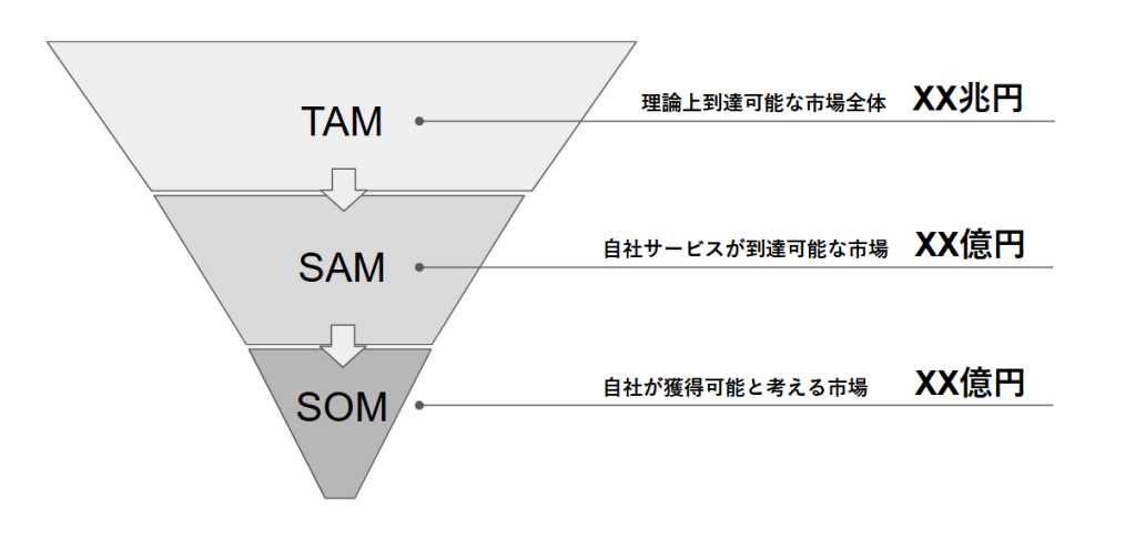 円状の図と異なるのは、TAM、SAM、SOMが図上では包含関係で描かれていない点ですが、矢印を足すと絞られているというイメージが伝わりやすくなります。