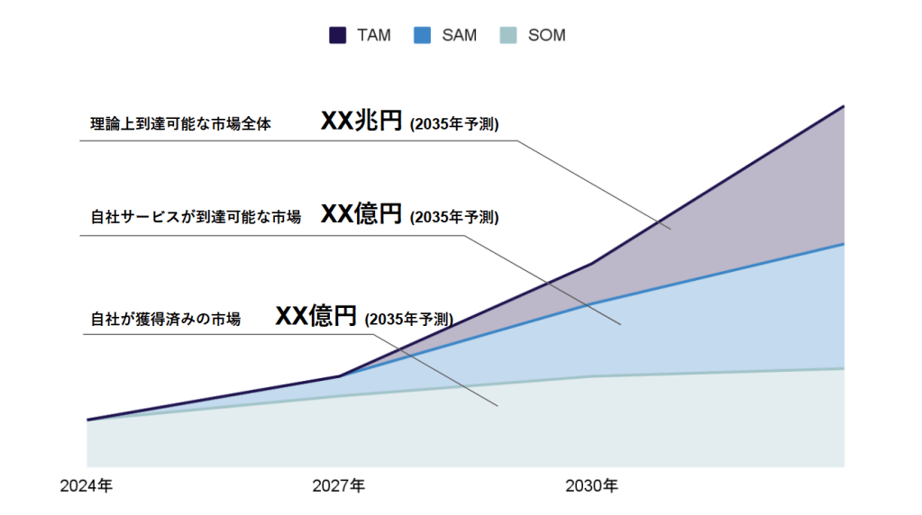 時系列の変化に合わせて、どのように市場(TAM、SAM、SOM)が拡大していくかを示す図